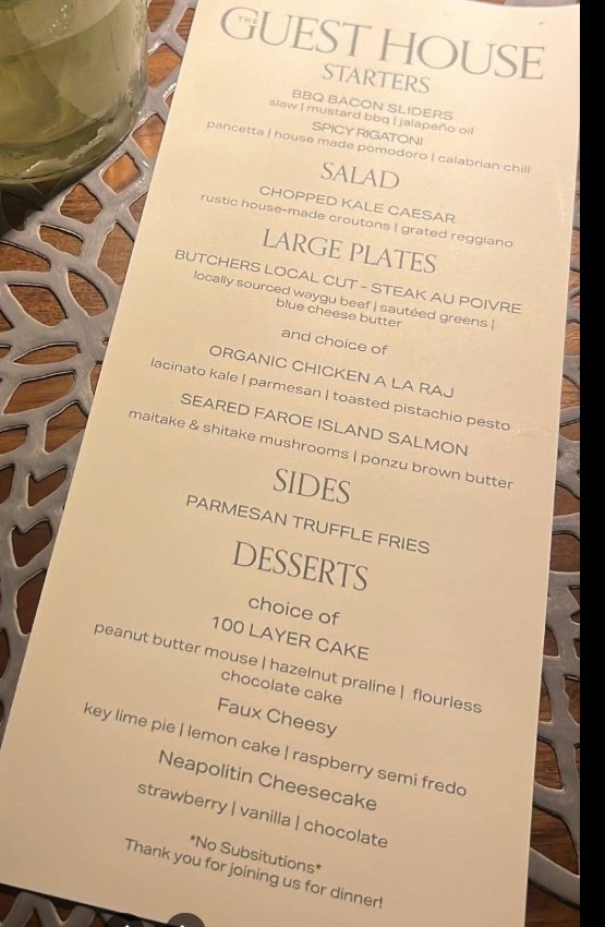 The guest house has such a fun atmosphere and vibe and the food was really good! I made a reservation for 7pm on a Friday night and got seated within a few minutes. It definitely has a girl dinner vibe, every one was dressed super cute and looking around a lot of the tables were just girls having a great time. I had never seen that before and it was nice. There were of course couples and other groups there as well. The music was so fun too, the DJ brought the Afro beats/Tulum vibes to the restaurant. Drinks were fun and the Food was also extremely yummy. The bread they bring out at the beginning is hands down the best starter bread I’ve had. It’s a croissant bread and it just melts in your mouth.